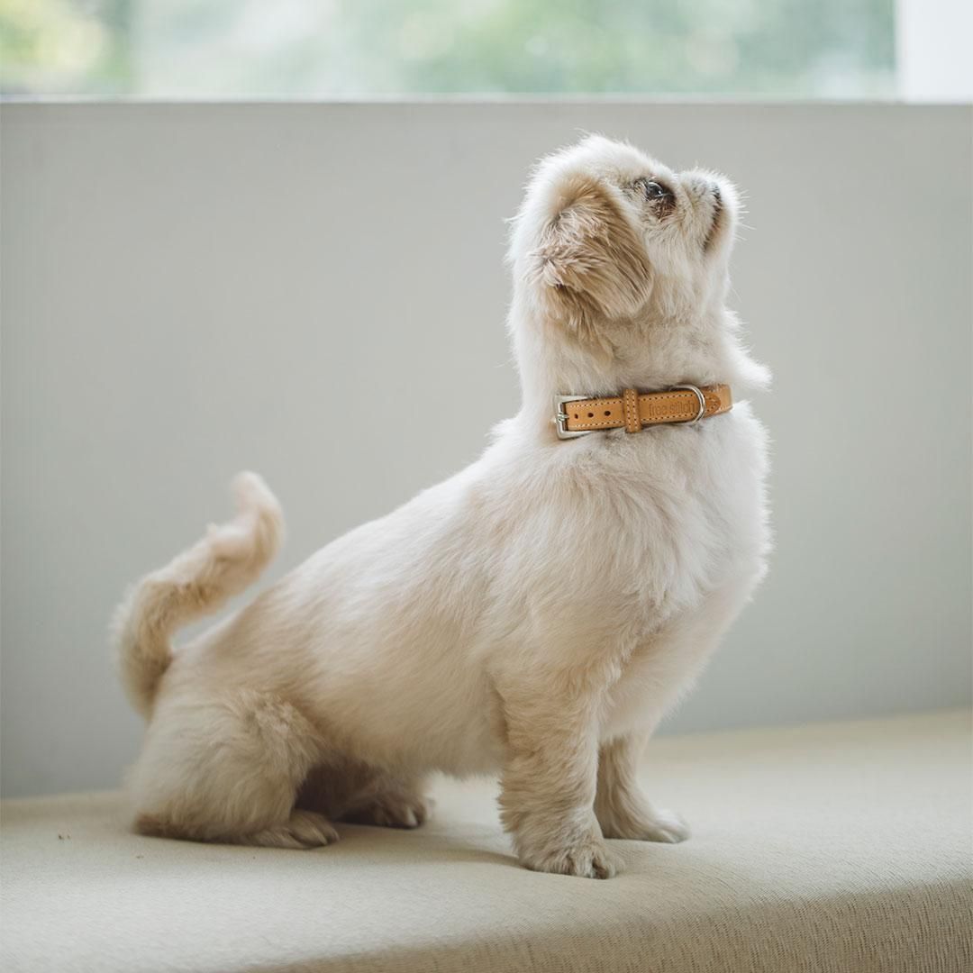 トイプーのパピーを迎え入れてからずっと大きさで悩んでいました。お散歩デビューも間近になりやっぱりヌメカラーが欲しくて…!首周りを測ると15cm。3Sかな?と思いましたが一回り大きめのサイズSSに!ヌメの硬さがあったので巻いてみるとちょうどいいサイズ!!これから柔らかくなっていくのもヌメの味わいが出てくるのも楽しみです^^またfree stitchの刻印がヌメカラーならではでとても素敵です。