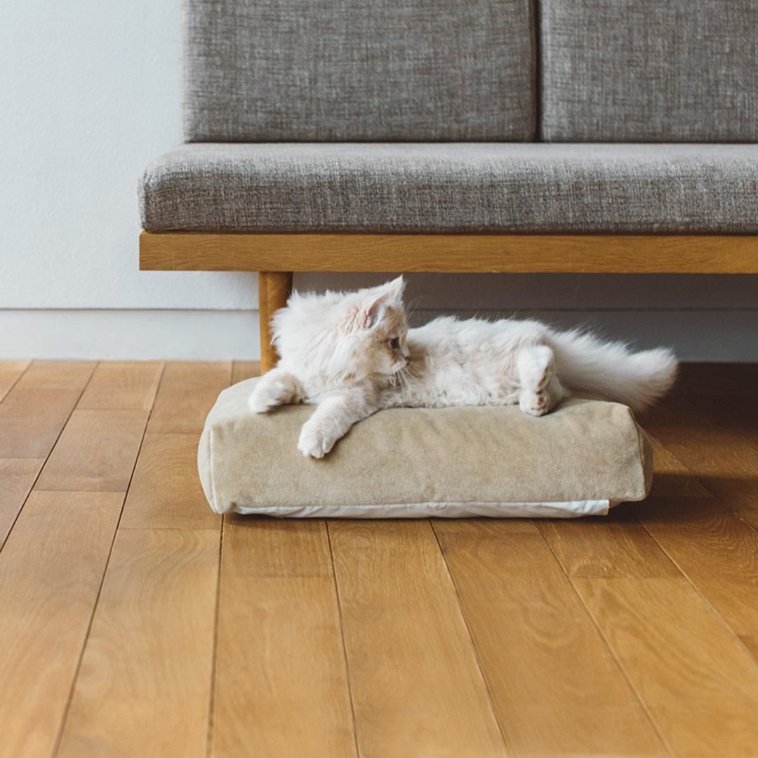 表面はペットの爪が引っかかりにくくするため、パイルの先をカットしたシャーリング加工を施し、ベルベットの様な光沢感と滑らかな肌ざわりに仕上がりました。タオル生地なので気にせずさっと洗えて、オールシーズン気持ちよく過ごせそうですね。