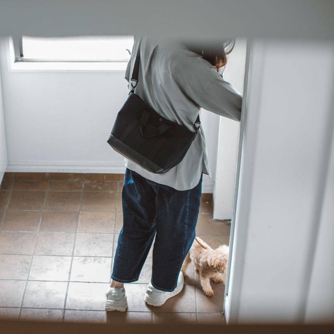 ナチュラルな風合いの4号帆布と、シャープな印象のターポリンが絶妙なバランスで融合したお散歩バッグ。