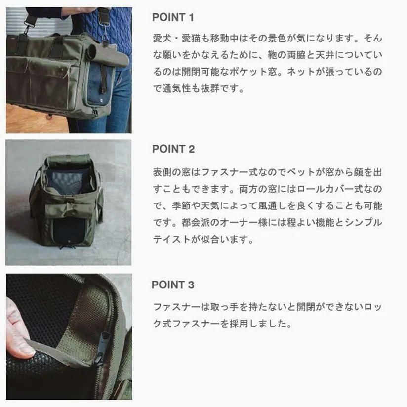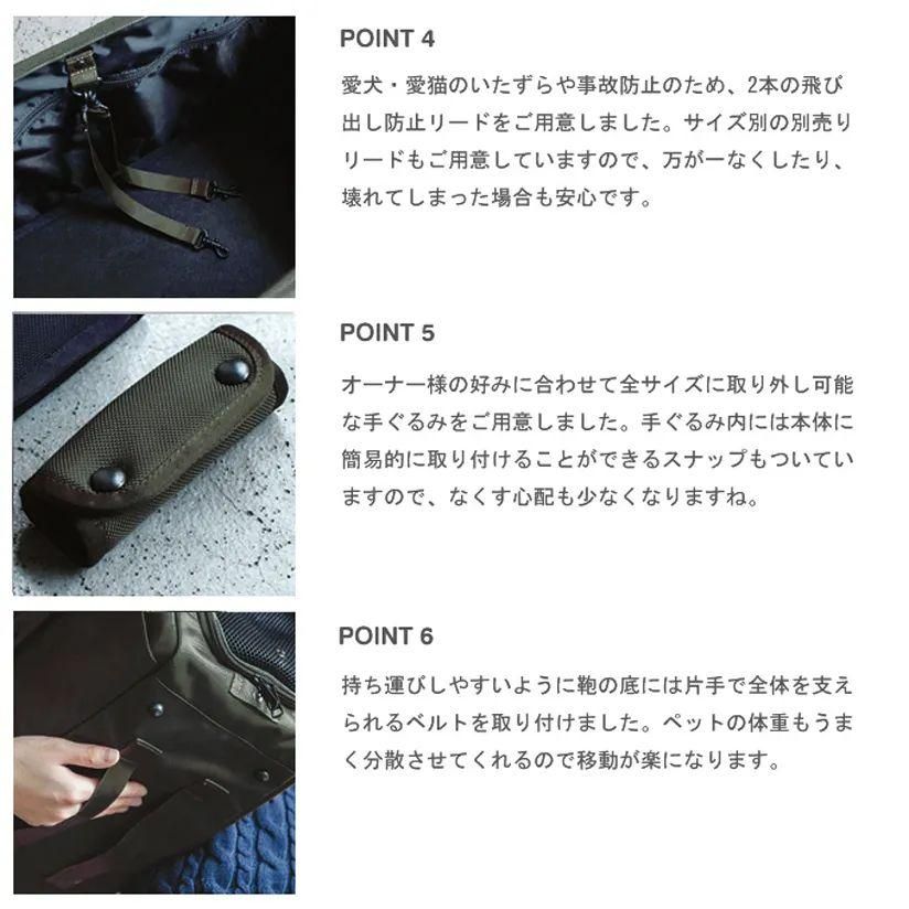 | 備考 | 【付属品】 ●斜めがけができる肩ひもつき ●飛び出し防止リード2本つき ●ストッパー機能付きのファスナー採用! ●安全にご利用いただくために ・ペットの不意の飛び出し・飛び降り事故を防ぐために、飛び出し防止リードの使用を推奨します。 ・ストッパー機能付きのファスナーは、ファスナーの取っ手が鞄のヘリ等に当たっているとストッパー機能が効かない場合があります。ペットを鞄に入れている間は、ファスナーの取っ手を体側の持ち手の間に来るようにして締めてください。 |